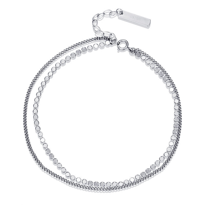 Add a modern touch to your jewelry collection with this elegant 925 sterling silver double chain anklet. Designed to bring out effortless style, this anklet features a beautiful layered look with two unique chains—one sleek and plain, and the other adorned with delicate circle links for added charm and texture.